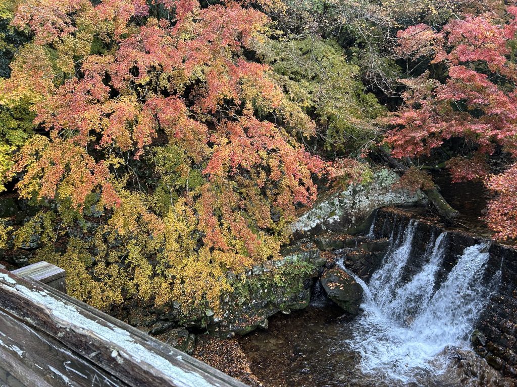 宿を出発して1時間20分程で一番の紅葉ポイント〈黒尊渓谷の神殿橋〉に到着。